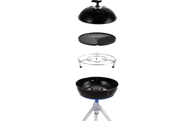 Grâce au déflecteur à l’arrière de la grille, la chaleur est idéalement répartie. Un support de casserole est fourni – le tout peut être emballé dans un sac de transport pratique.