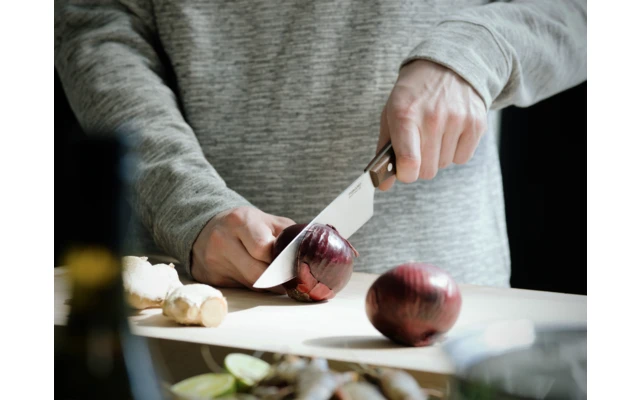 La série de couteaux Norr offre une expérience solide et authentique pour la découpe classique. Les matériaux de haute qualité en font un choix durable et économique. Le grand couteau de cuisine Norr pour tous les usages a une lame solide qui le rend parfait pour la plupart des tâches de coupe, par exemple pour hacher la viande et les légumes. La lame est fabriquée en acier inoxydable allemand de haute qualité. Le manche est en bois d’érable norvégien certifié FSC (Forest Stewardship Council) à 70 %, traité au Kebony pour augmenter la stabilité et la dureté.