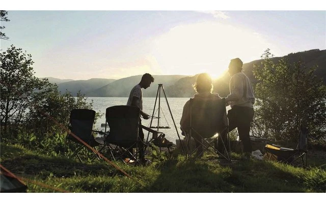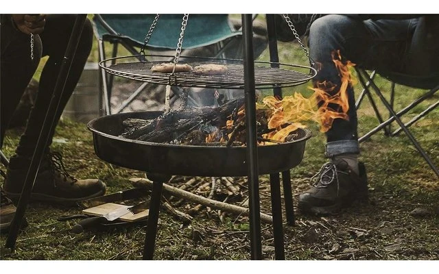 Base de feu de camp et BBQ combinés avec une grande zone de cuisson. La base de feu peut être utilisée séparément, à la maison ou au camping, ou avec le trépied comme barbecue. Ajustez la vitesse de cuisson en soulevant ou en abaissant le barbecue suspendu.