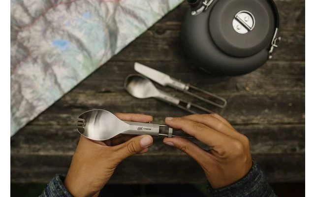Ceux qui font attention à chaque gramme lors de leurs randonnées, mais qui ne veulent renoncer ni à la fourchette ni à la cuillère, sont bien servis avec cette solution pratique et bien pensée. Les couverts pliables peuvent être utilisés aussi bien comme fourchette que comme cuillère. La surface de repas est polie.