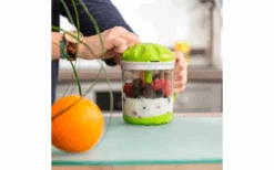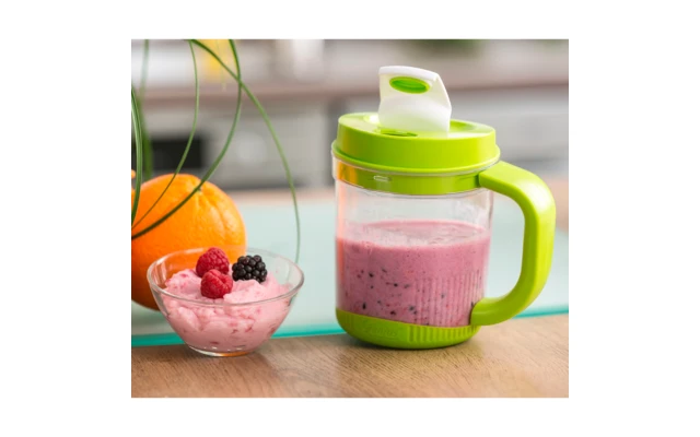 Avec le Twist N Joy, vous pouvez transformer les aliments en un rien de temps : Mixez des soupes, des sauces, des dips ou des desserts, hachez des herbes ou des légumes et préparez des aliments pour bébés, des smoothies et des boissons mixées – le tout avec un appareil pratique. Le Twist N Joy séduit par son design moderne et coloré ainsi que par sa facilité d’utilisation et de nettoyage.