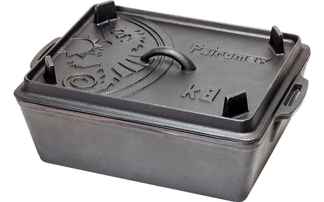 L’effet anti-adhérent naturel de la fonte, qui s’améliore à chaque utilisation, rend la cuisson dans le moule à manqué particulièrement agréable. Les deux poignées garantissent une manipulation pratique, ce qui te permet de le sortir facilement du four. Comme il a un fond plat, ce moule carré fonctionne sur tous les types de cuisinières, y compris l’induction. Le moule à caquelon est le complément idéal de tes produits en fonte Petromax, car le couvercle de garde peut être retiré à l’aide du lève-couvercle Petromax.