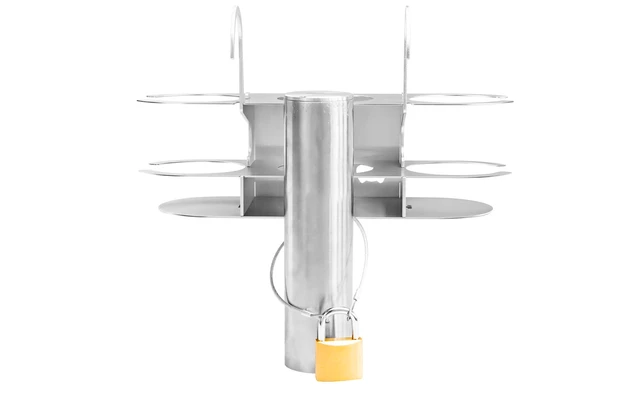 Le porte-gobelet est entièrement en acier inoxydable, il s’emboîte et résiste au vent et aux intempéries. Le système de sécurité bien pensé empêche tout retrait non autorisé : le porte-gobelet peut être verrouillé à l’aide d’un câble en acier et d’un cadenas. (Le cadenas n’est pas compris dans la livraison !)