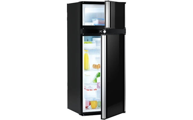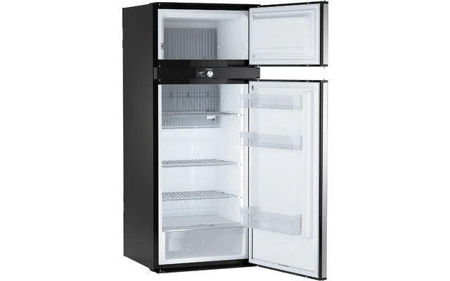 Ce réfrigérateur à absorption de nouvelle génération convainc par un confort inégalé jusqu’à présent : sélection automatique de la source d’énergie (12 V, 230 V ou gaz), une porte qui s’ouvre vers la gauche et vers la droite et un intérieur polyvalent avec beaucoup de place pour vos aliments